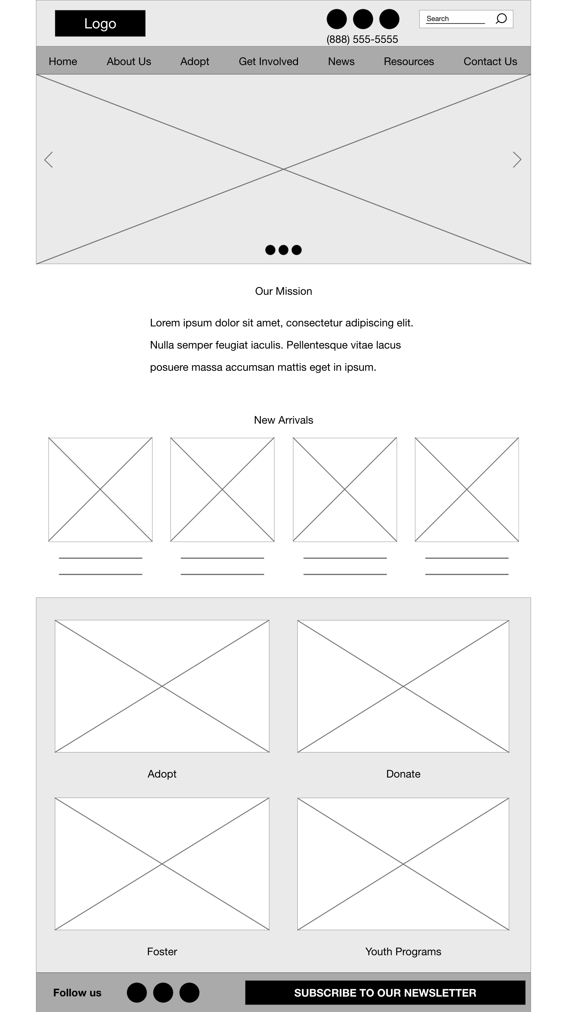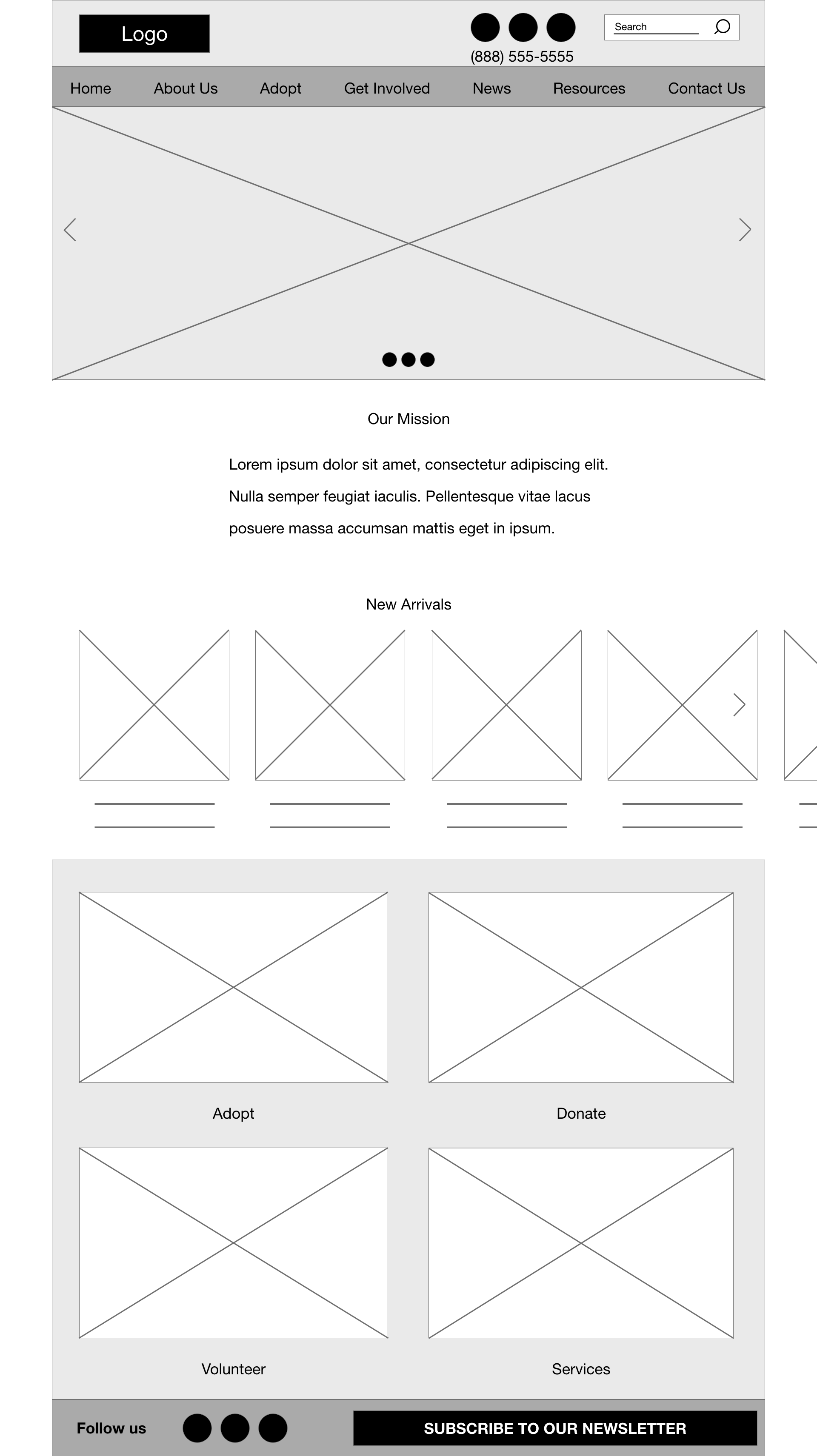 Based on the usability study, participants wanted a way to find and view available pets for adoption. Quick navigation access points were added to the home screen further down the page to assist with the site flow and navigation, making it easier for users to access.