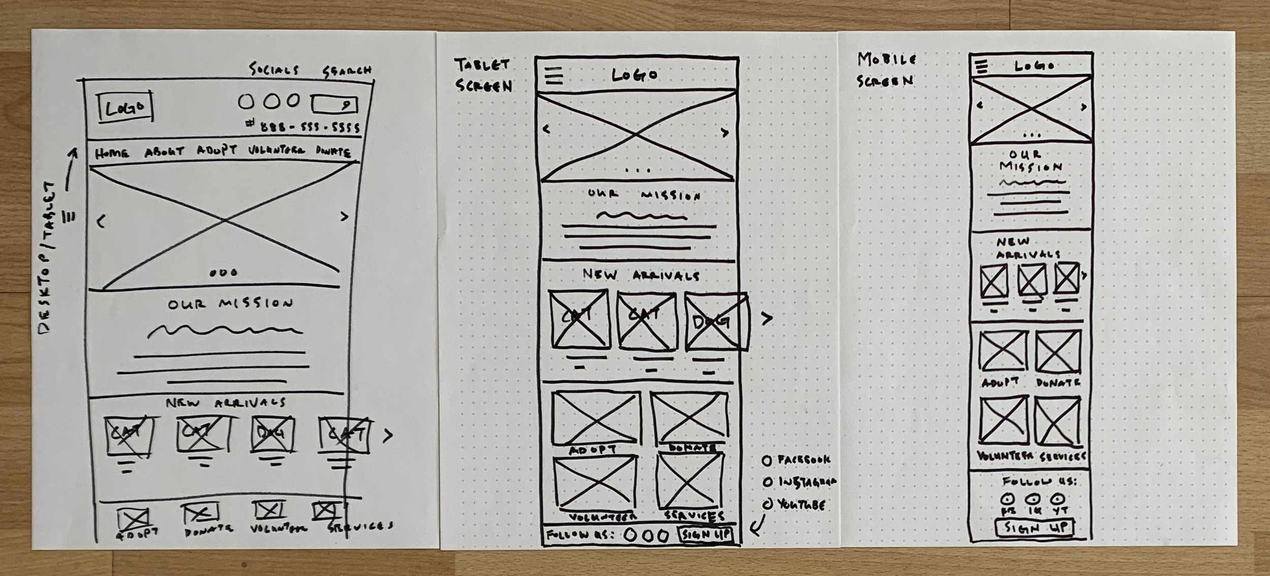 As a responsive website, UI designs focused on streamlining the flow for both Desktop and Mobile. Featured here is the home screen of the Pet Adoption Website Home Page in both hi-fidelity layout in both modes.